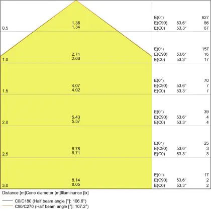 De gradenbundel geeft informatie over hoe breed het licht wordt uitgestraald. Dit zit tussen de 0 en 360 graden (D). Hoe kleiner de hoek, hoe specifieker de lichtbundel is. Over het algemeen is een smalle gradenbundel perfect voor sfeer- of accentverlichting, terwijl een brede gradenbundel ideaal is om grote oppervlaktes te verlichten.