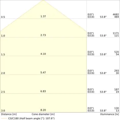 De gradenbundel geeft informatie over hoe breed het licht wordt uitgestraald. Dit zit tussen de 0 en 360 graden (D). Hoe kleiner de hoek, hoe specifieker de lichtbundel is. Over het algemeen is een smalle gradenbundel perfect voor sfeer- of accentverlichting, terwijl een brede gradenbundel ideaal is om grote oppervlaktes te verlichten.